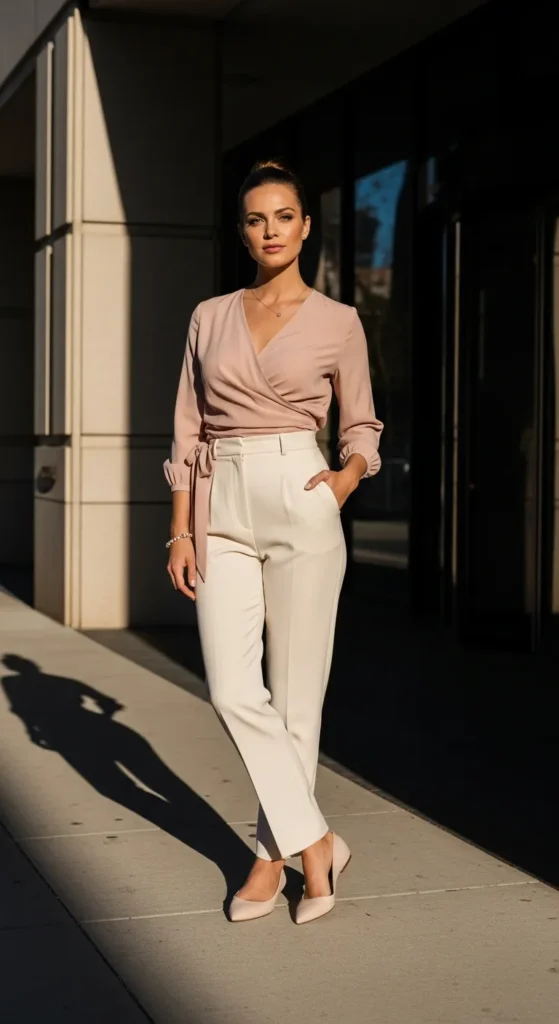 A soft wrap top paired with tailored straight-leg trousers creates a flattering and polished outfit that still feels relaxed.