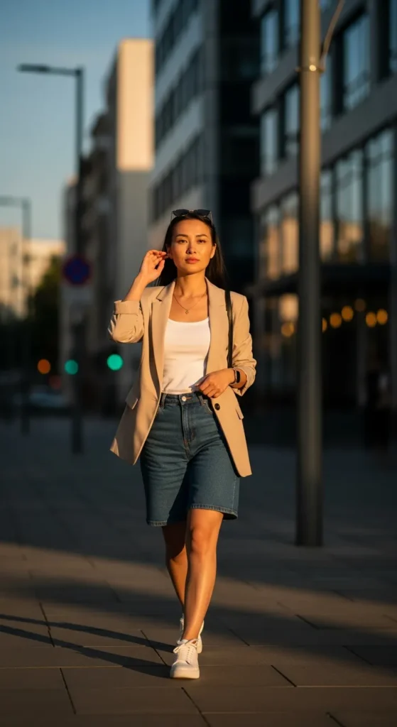 A lightweight blazer layered over a simple tank and denim shorts creates an effortless mix of casual and polished style that works beautifully for city outings.