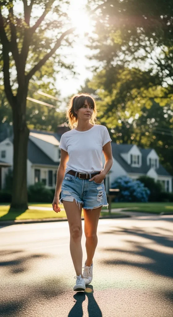 The white tee and denim shorts combination is a summer classic for a reason. It feels effortless, comfortable, and always stylish when you keep the fit slightly relaxed.