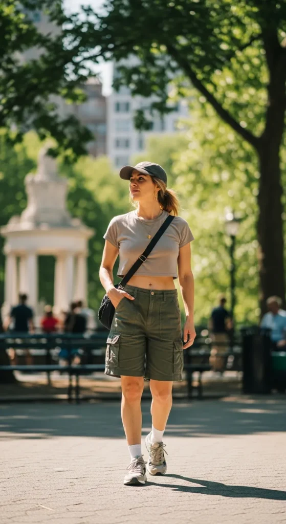 Cargo shorts bring a practical edge to summer outfits, especially when styled with a fitted cropped tee. The contrast between structured pockets and a slim top creates balance.