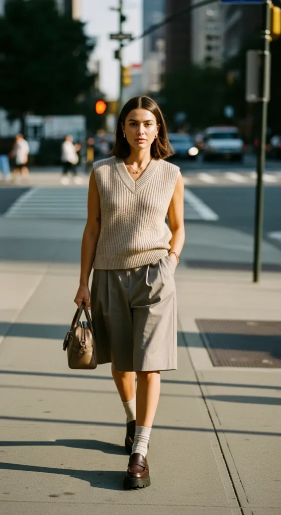 A sleeveless knit vest styled with relaxed shorts brings a trendy yet understated feel that works perfectly for casual city days.