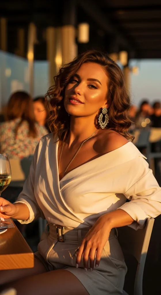 Stylist Suggestion: Try statement earrings and soft curls. Since the neckline is open, earrings naturally draw attention upward and frame the face beautifully.