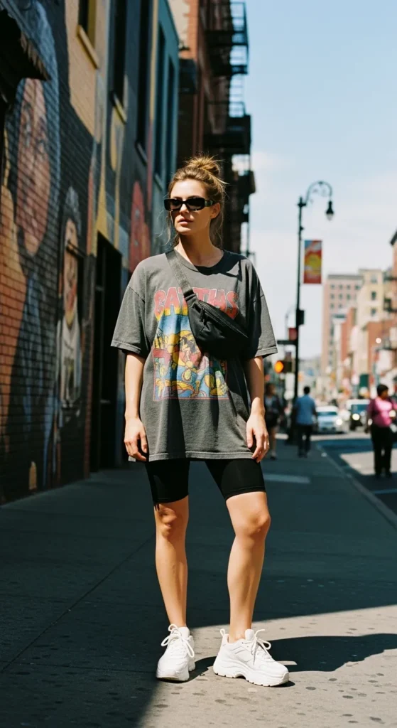 An oversized graphic tee with biker shorts is the ultimate off-duty summer outfit. It feels relaxed, sporty, and perfect for days when you want comfort but still want to look cool and confident.