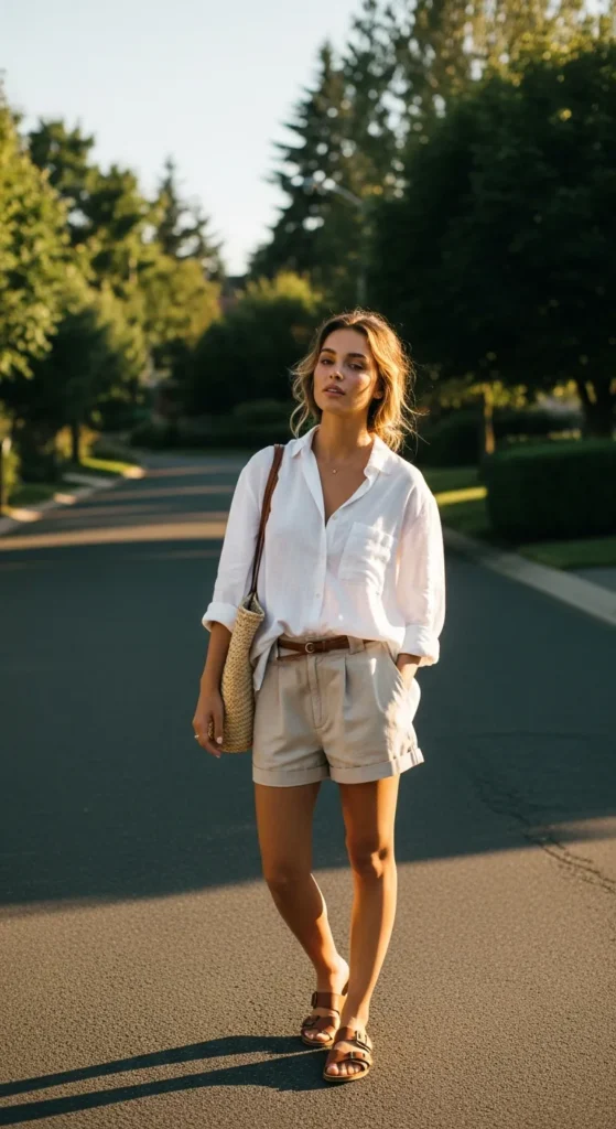There’s something effortlessly elegant about a slightly oversized linen shirt paired with simple cotton shorts. The breathable fabrics make this outfit feel airy and calm, perfect for warm afternoons when comfort and style need to work together naturally.
