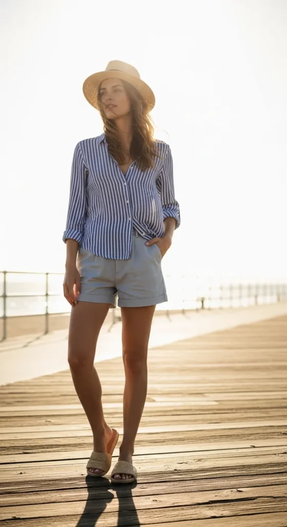 A striped button-down shirt worn slightly open over relaxed shorts creates a breezy coastal look that feels fresh and timeless for summer days.