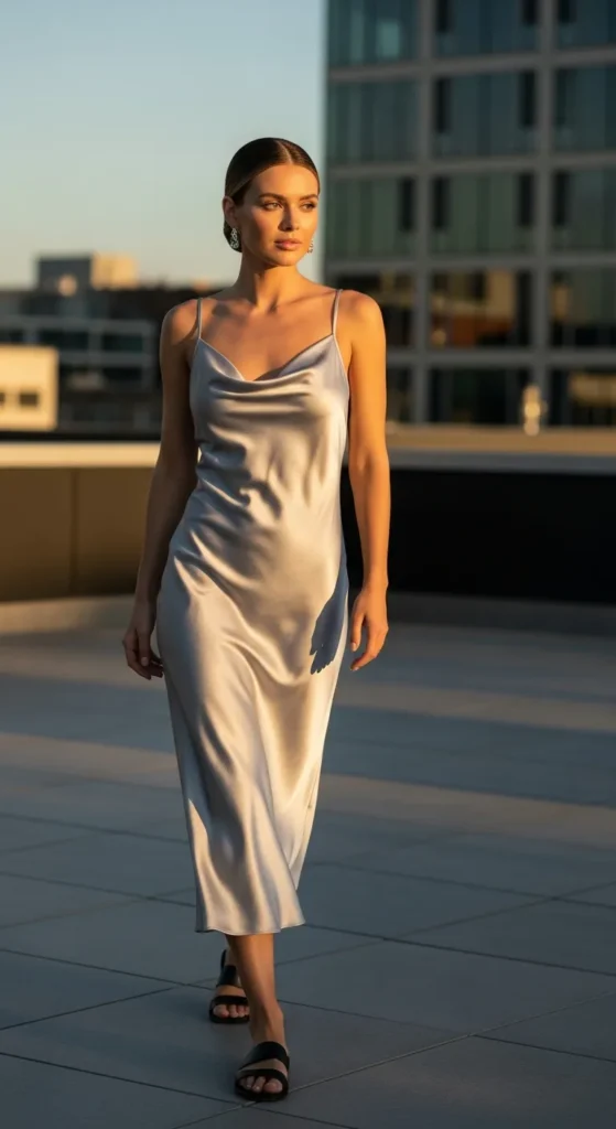 1. Liquid Silver Slip Dress with Minimal Sandals