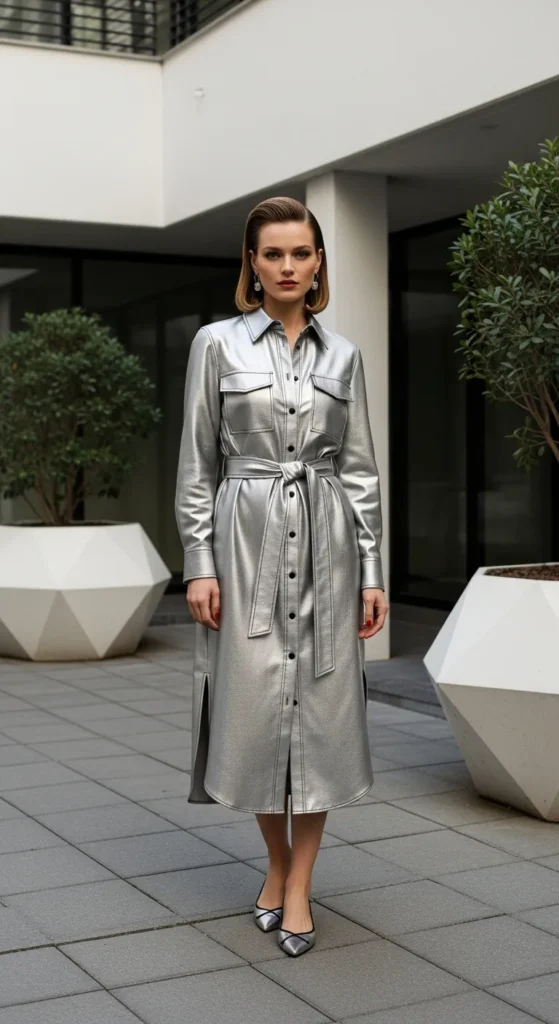 A silver belted shirt dress combines structure with shine, creating a confident summer silhouette. It’s polished enough for daytime events yet playful enough for warm-weather styling.