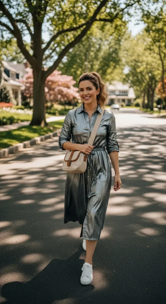 A silver button-front dress feels retro-inspired yet modern in shine. Styled with sneakers, it becomes approachable and perfect for long summer days that move from errands to casual meetups.