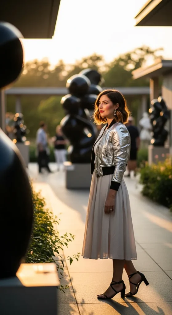 A silver cropped jacket adds edge when layered over a flowy summer skirt. The mix of structured shine and soft movement feels expressive and fashion-forward.