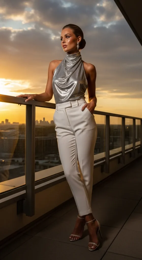 A silver halter top adds bold shine near the face, balanced by soft white trousers. This outfit feels fresh, flattering, and perfect for warm evenings when you want an elevated yet breathable look.