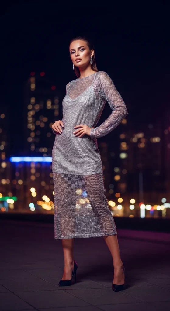 A silver mesh overlay dress adds depth and texture without feeling heavy. It catches light beautifully and feels perfect for summer nights when you want something memorable yet breathable.