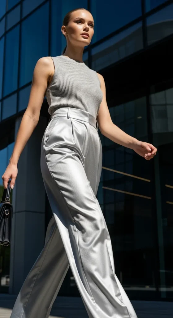 Silver wide-leg trousers create a bold silhouette while staying breathable for summer. Paired with a sleeveless knit, the look feels strong, balanced, and ideal for women who love effortless sophistication.