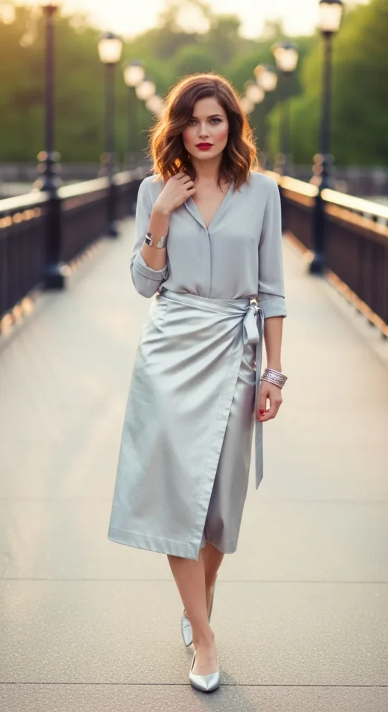 A silver wrap skirt brings adjustable comfort and gentle shine, paired with a soft gray blouse for balance. This look feels feminine, modern, and easy to wear on warm summer afternoons.