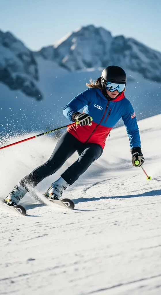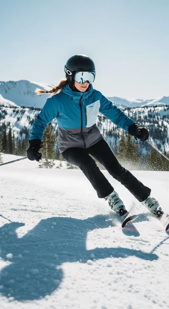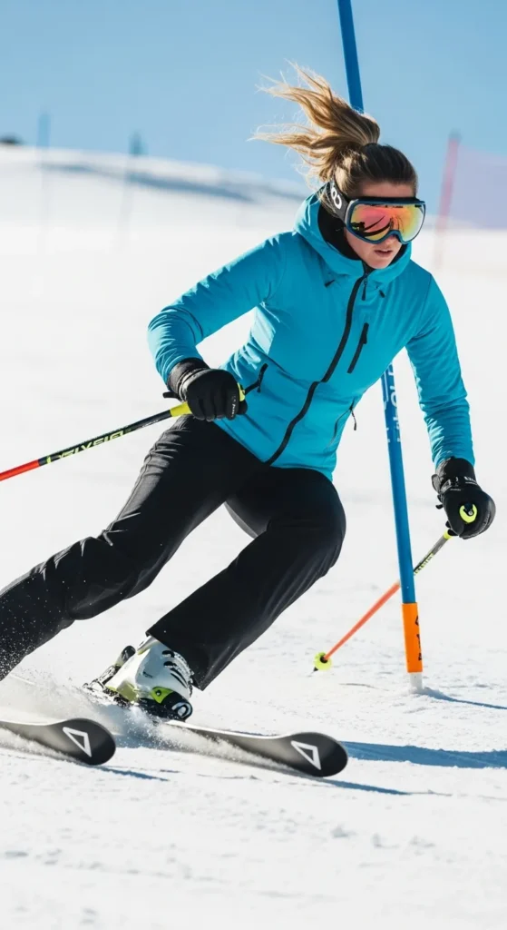 A fitted jacket and stretch ski pants create a flattering, athletic silhouette. This outfit feels strong and confident, perfect for women who love movement focused style.