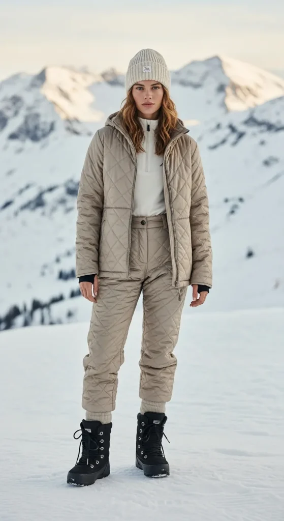 A soft beige quilted jacket paired with matching snow pants feels calm, modern, and effortlessly chic. This look balances warmth and movement, making it perfect for long ski sessions followed by relaxed lodge moments.