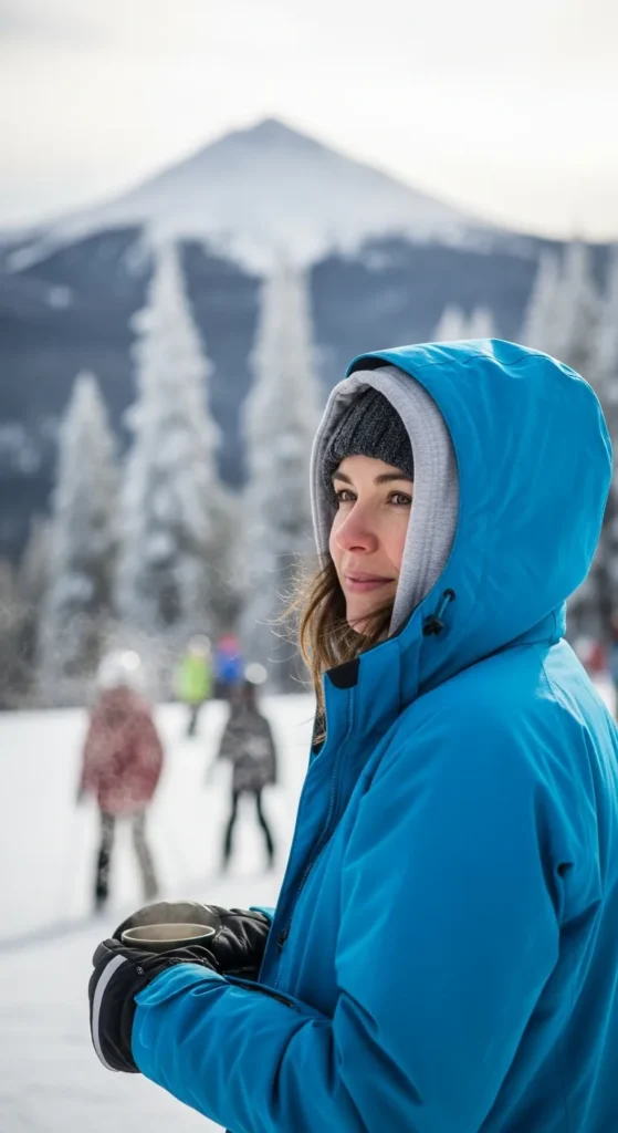 A hoodie layered under a ski jacket adds comfort and personality. This look feels youthful and relaxed, ideal for casual ski days and beginner-friendly slopes.