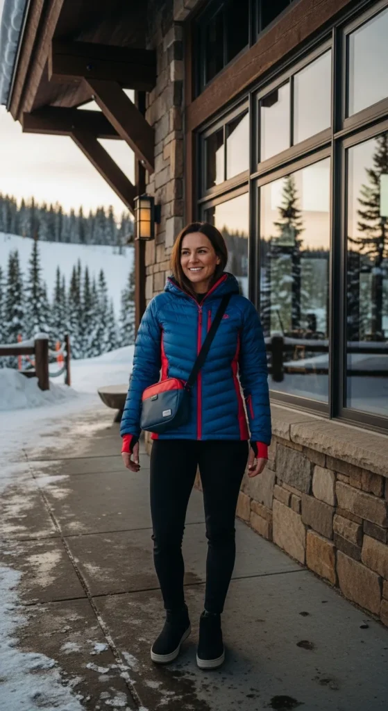 This outfit mixes a lightweight puffer vest over a fleece hoodie with thermal leggings. It’s relaxed, cozy, and perfect for casual skiing or wandering the village with a warm drink in hand.