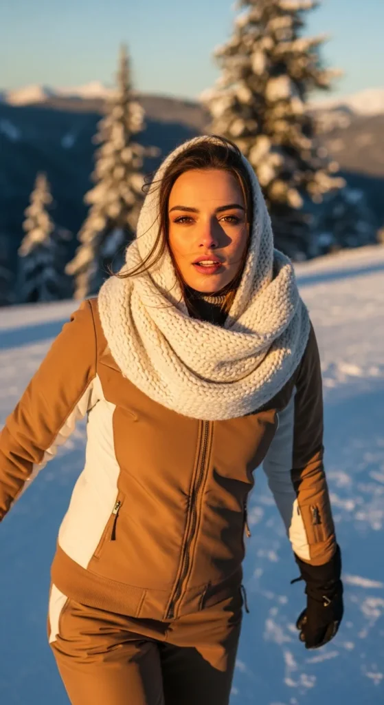 Warm camel and cream tones bring softness to cold mountain settings. This outfit feels inviting, stylish, and perfect for women who love cozy elegance in winter environments.