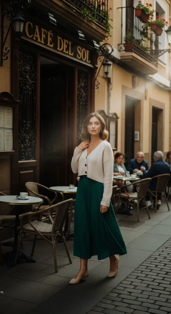 A cropped cardigan layered over a midi skirt feels cozy yet elegant. Perfect for spring or fall, this look balances warmth with graceful movement.