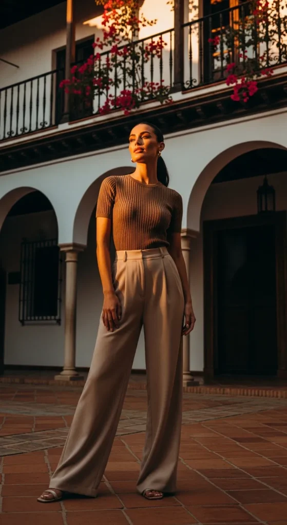 A tailored vest paired with wide-leg pants creates a sharp yet breathable silhouette. It feels modern, confident, and perfect for city sightseeing that transitions easily into a stylish dinner plan.