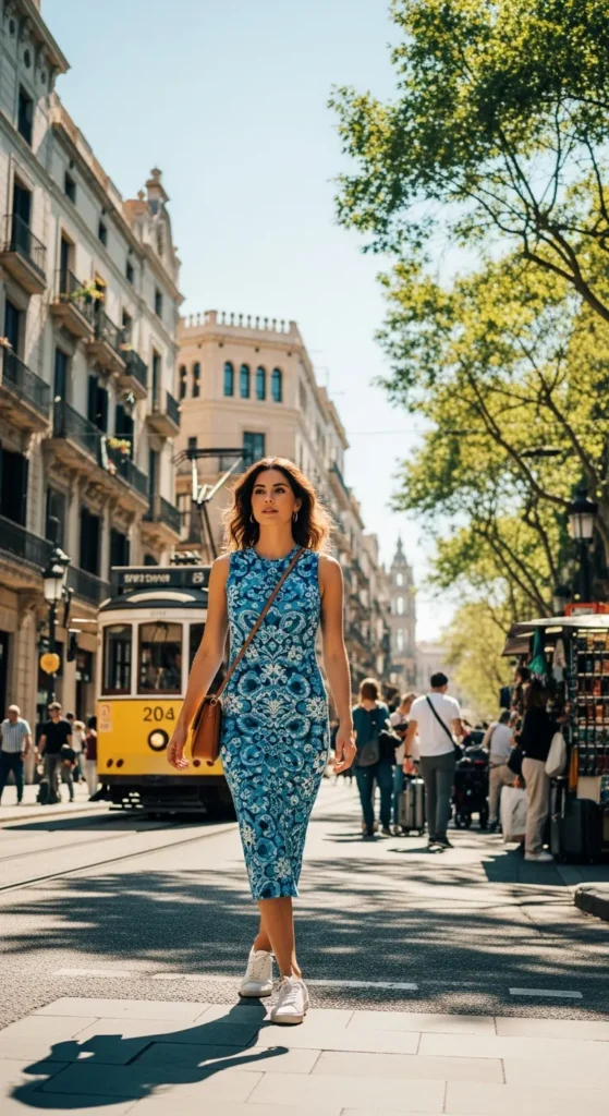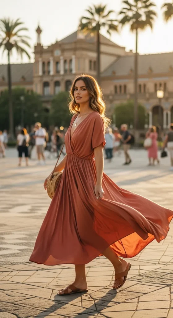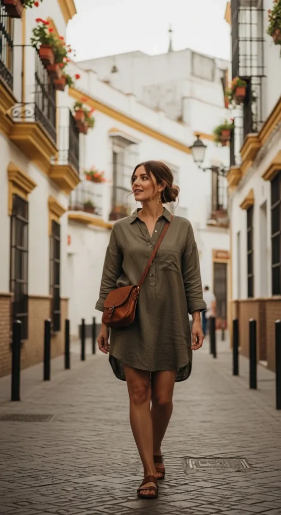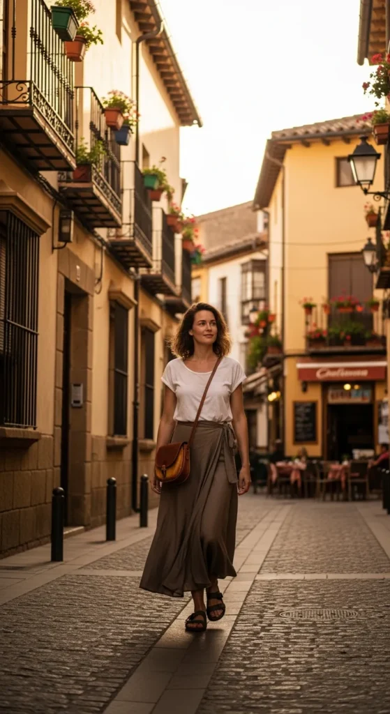 A flowy midi dress moves beautifully in the Spanish heat and feels romantic without trying too hard. It’s ideal for long walks, outdoor lunches, and golden-hour strolls through historic neighborhoods.