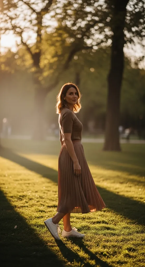 A soft knit top paired with a pleated skirt creates texture and movement. It feels feminine and polished while remaining comfortable for long walks and sightseeing.