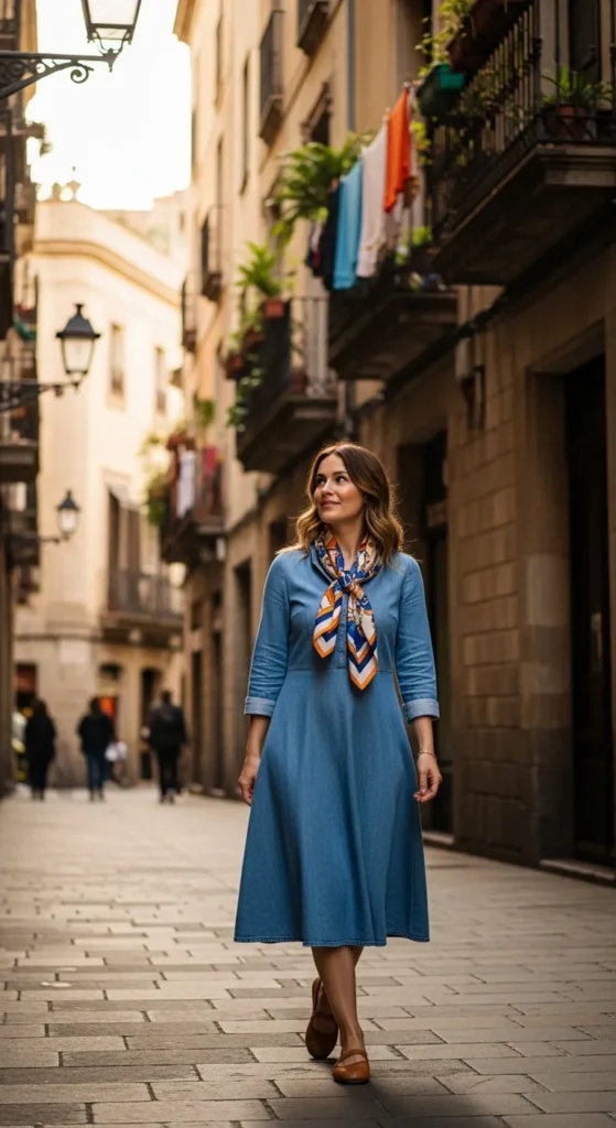 A light denim dress feels casual but stylish when accessorized thoughtfully. It’s practical, timeless, and perfect for everyday travel moments.