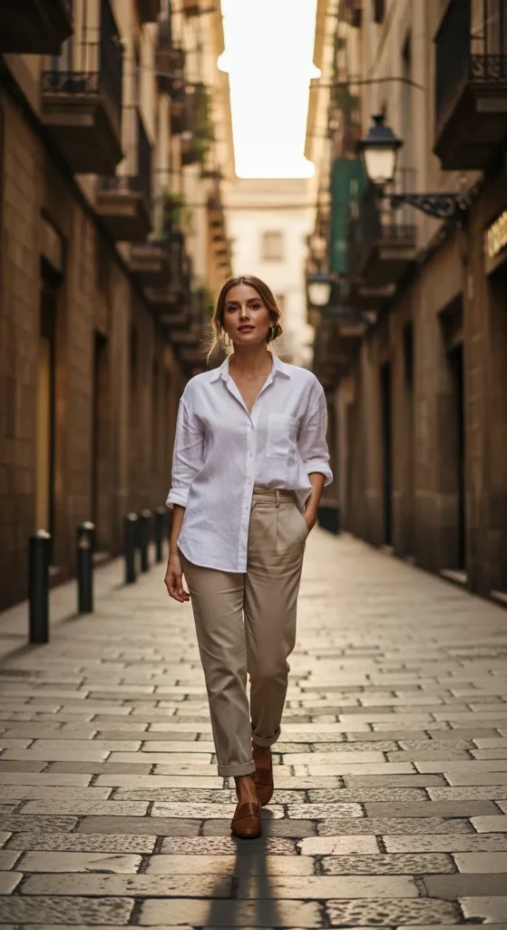 A crisp linen shirt tucked into relaxed trousers feels effortlessly European. It’s breathable, polished, and perfect for wandering historic streets while still looking put together for a spontaneous café stop.