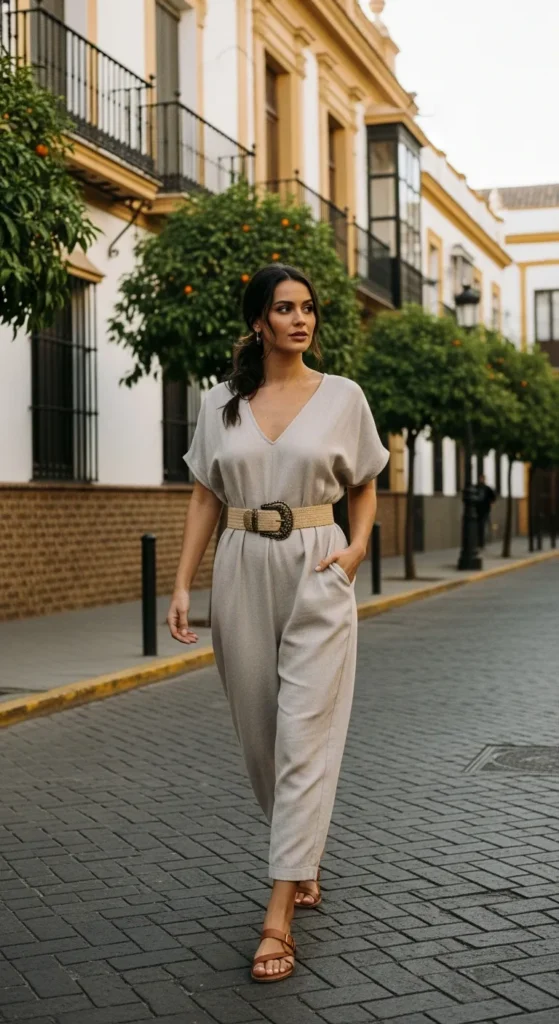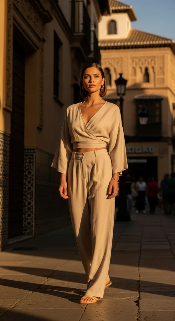 A neutral co-ord set makes getting dressed effortless while still looking intentional. Matching pieces feel chic in Spain’s stylish cities and photograph beautifully against historic architecture.