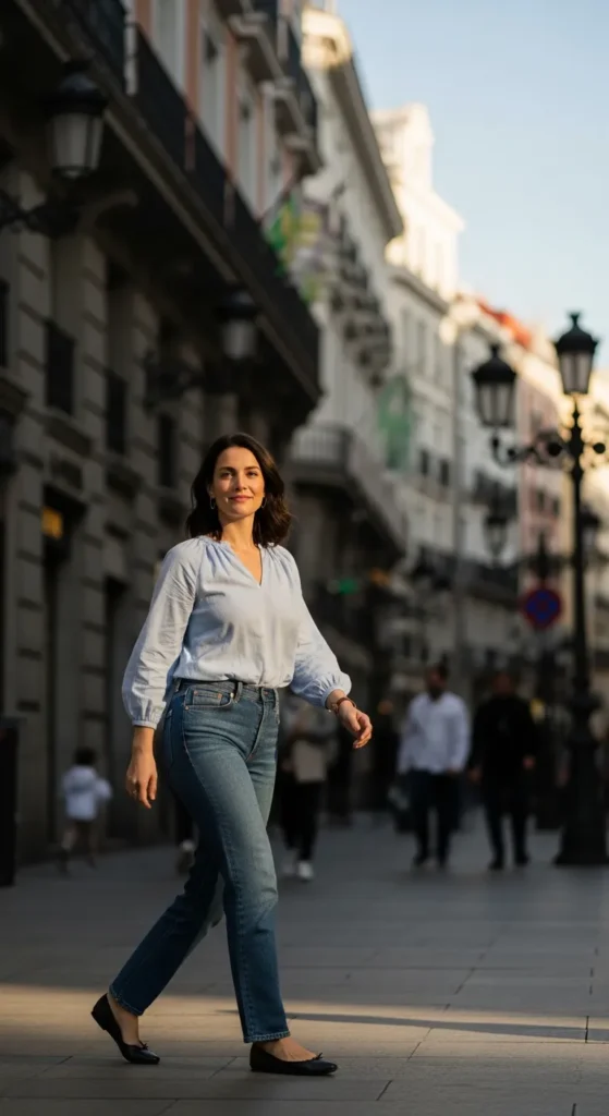 A soft blouse paired with straight jeans is timeless and universally flattering. It feels comfortable, chic, and appropriate for nearly every Spanish city setting.