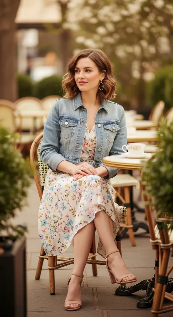 A soft floral wrap dress brings effortless movement while the cropped denim jacket keeps the look playful and grounded. It feels feminine, relaxed, and perfect for a daytime birthday with friends and laughter.