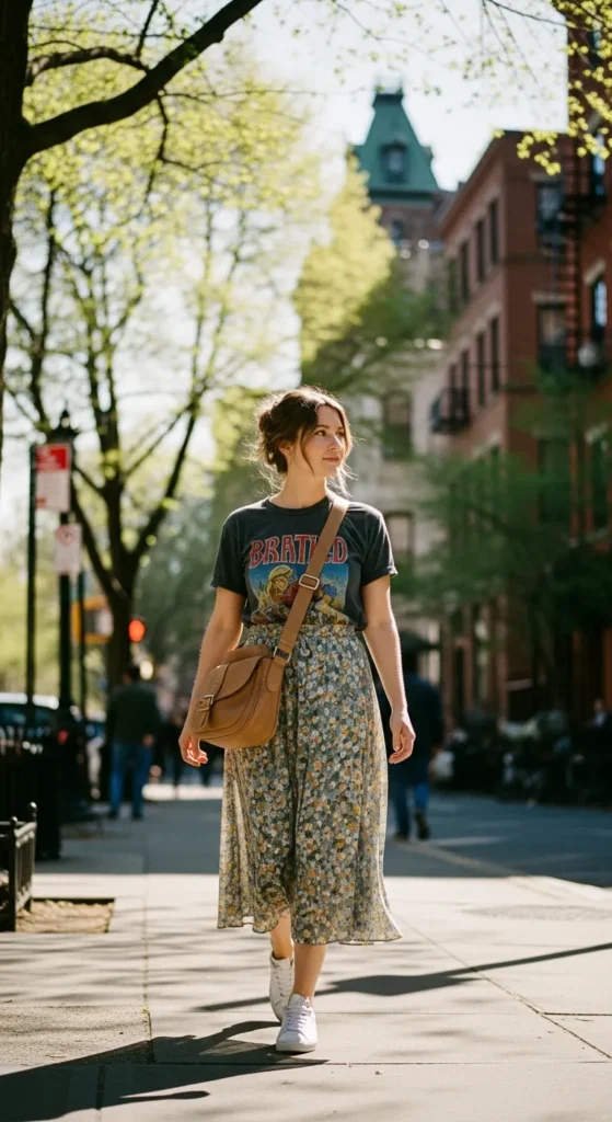 11. Graphic Tee with Midi Skirt and Sneakers