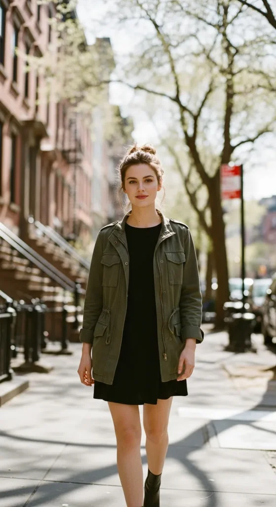 A light utility jacket adds structure and edge to a simple mini dress. This outfit feels confident, fun, and perfect for unpredictable spring weather during birthday plans.
