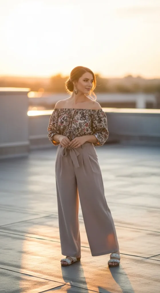 This look feels confident and subtly flirty without trying too hard. The off shoulder neckline balances beautifully with wide leg pants, creating an outfit that feels special but still comfortable.