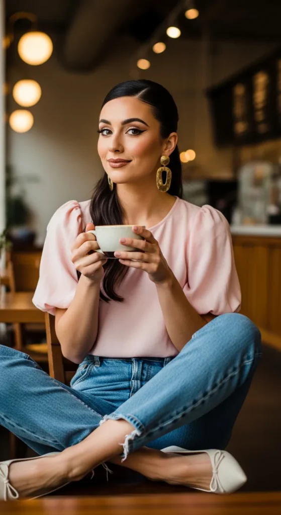 Puff sleeves instantly add celebration energy to a simple outfit. Paired with straight leg jeans, this look feels balanced, trendy, and perfect for a birthday dinner or casual evening plans.