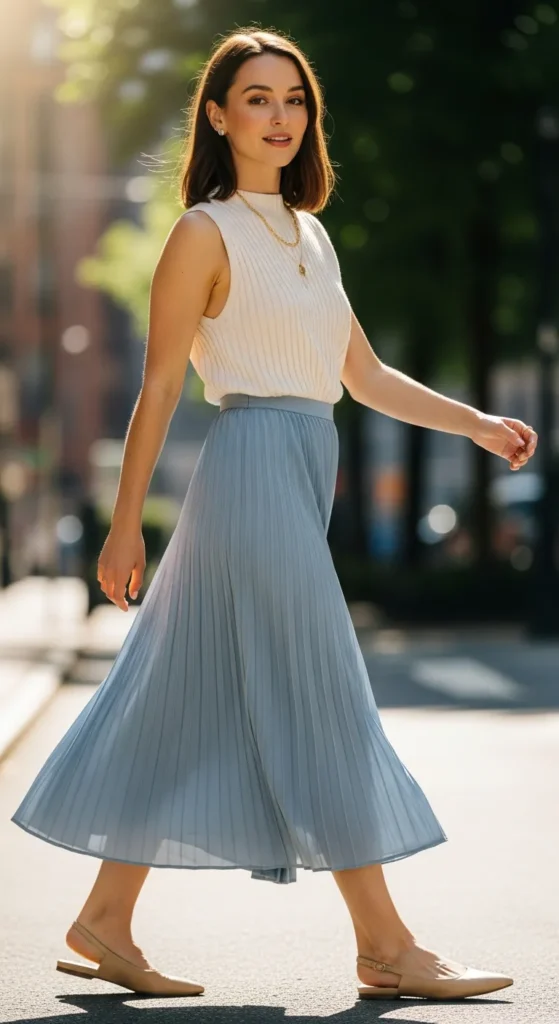 This outfit feels light, feminine, and polished. A sleeveless knit top paired with a pleated skirt moves beautifully and works perfectly for spring birthdays that call for soft elegance.
