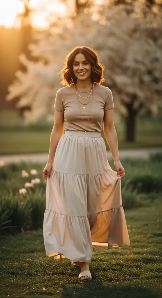 A tiered maxi skirt brings movement and joy, while a fitted tee keeps the outfit grounded and wearable. It’s playful, comfortable, and ideal for a relaxed spring birthday celebration.
