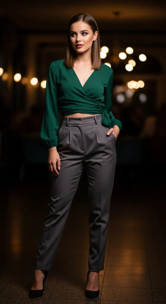 A wrap top naturally highlights your shape, and high waisted trousers add polish. This outfit feels confident, grown, and perfect for a birthday dinner or evening celebration.