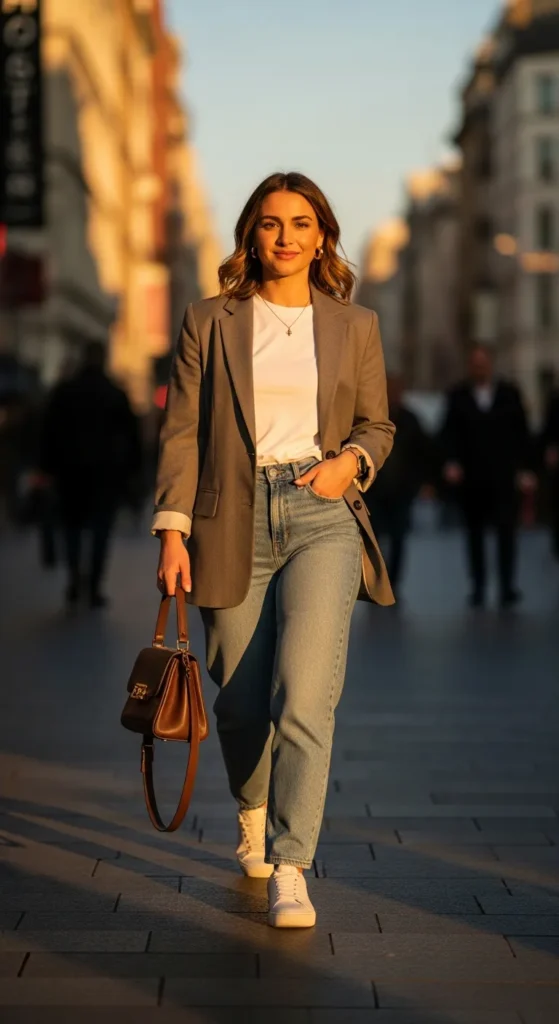 A lightweight blazer thrown over a simple tee and relaxed jeans instantly elevates a sneaker outfit. It feels grown up but still casual, ideal for spring days on the go.