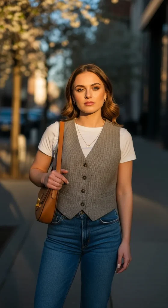 Stylist Suggestion: Add a small shoulder bag and keep colors neutral. This highlights the vest without making the outfit feel busy.