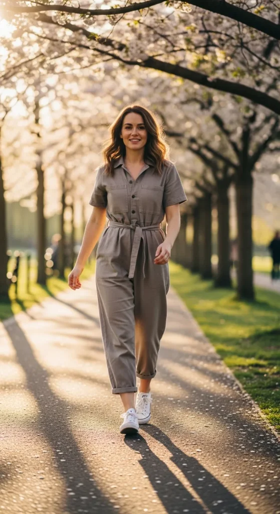 A relaxed fit jumpsuit paired with sneakers creates an easy one and done spring outfit. It feels stylish without effort and works for a variety of casual plans.
