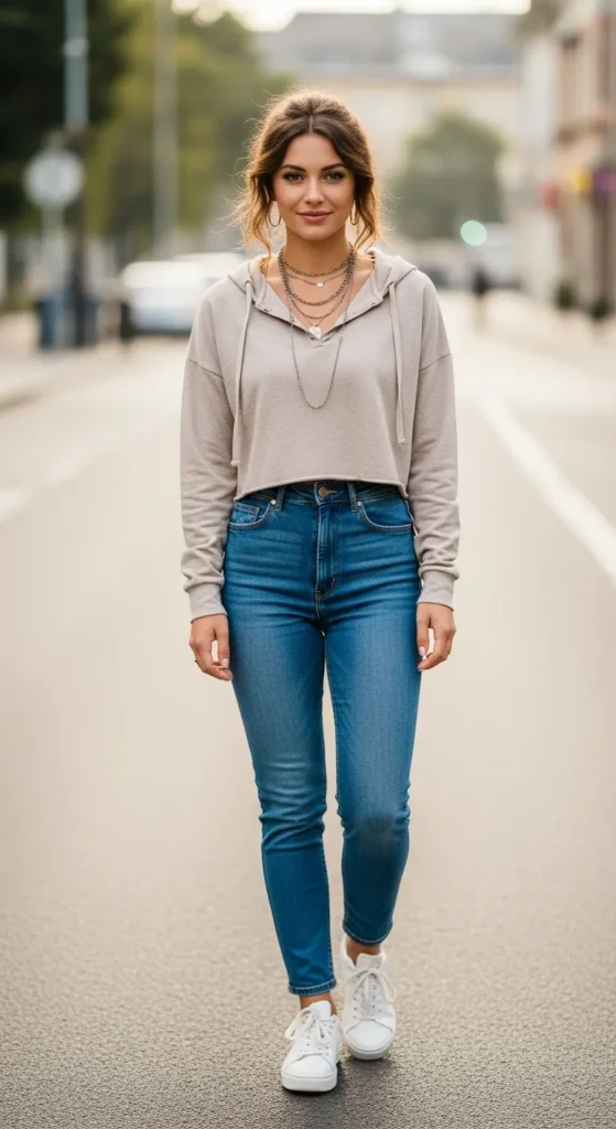 A cropped hoodie paired with high waisted jeans creates a youthful, relaxed silhouette. Sneakers keep it practical while still feeling stylish enough for casual daytime plans.
