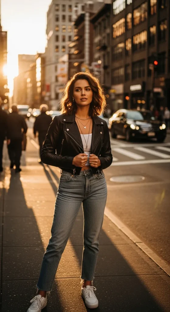 A cropped jacket layered over a basic top and straight jeans adds structure without heaviness. Sneakers keep the look practical and balanced.