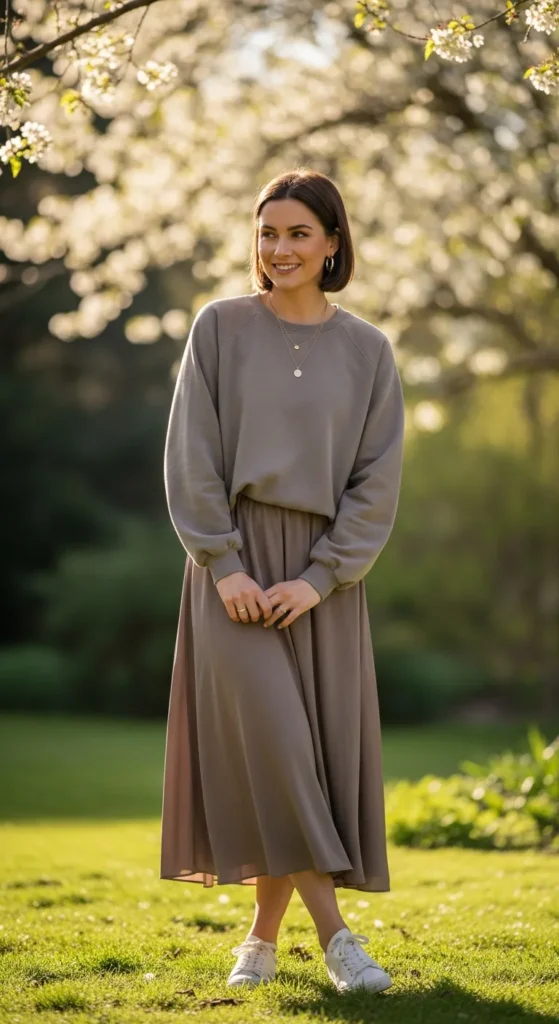A relaxed sweatshirt paired with a midi skirt blends comfort and style beautifully. Sneakers make it practical while keeping the outfit fresh and modern.