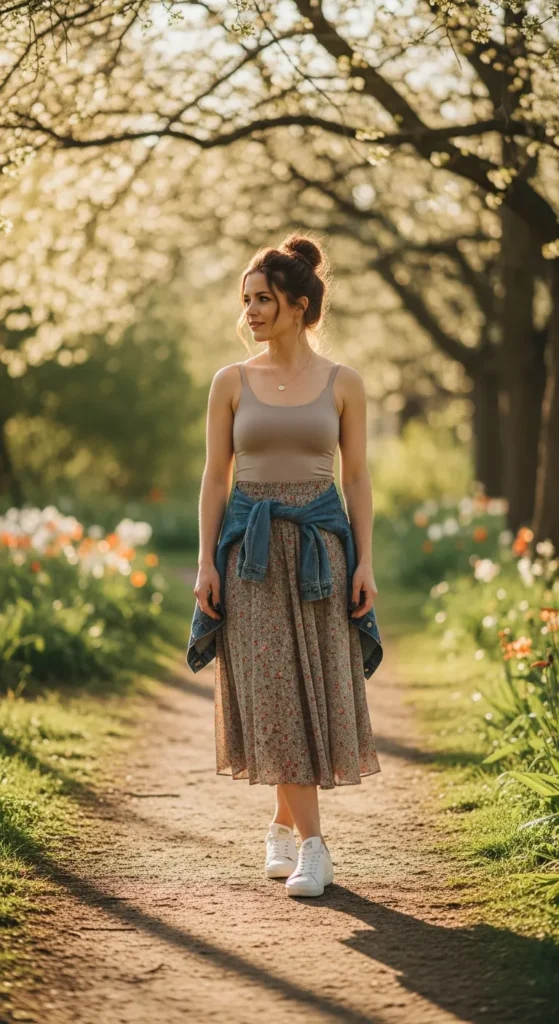 A flowy midi skirt paired with a fitted tank top feels feminine and easy. Sneakers add contrast, making the outfit comfortable for walking while still looking thoughtfully styled.