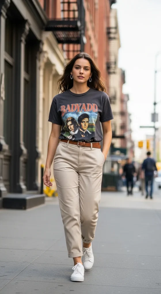 A casual graphic tee paired with relaxed trousers creates a cool, laid-back look that feels current. Sneakers keep it grounded and perfect for everyday wear.