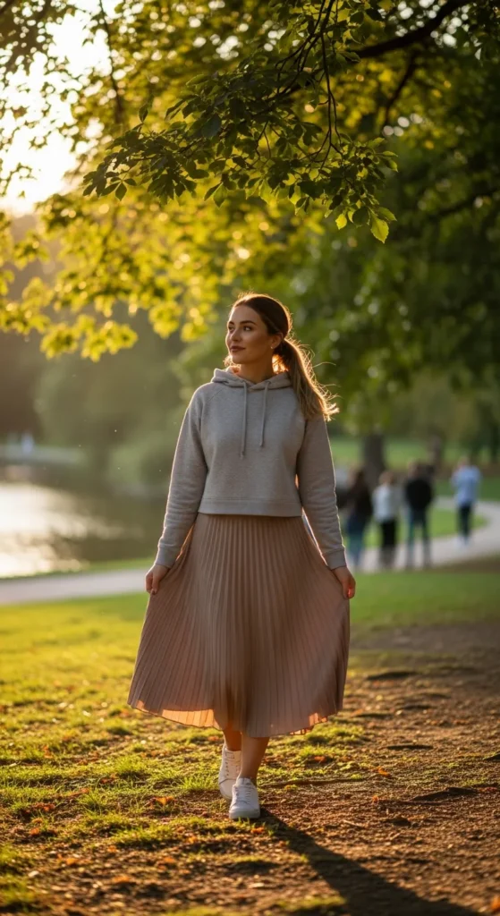 A lightweight hoodie paired with a pleated skirt blends sporty and feminine effortlessly. Sneakers balance the look, making it wearable for everyday spring moments.