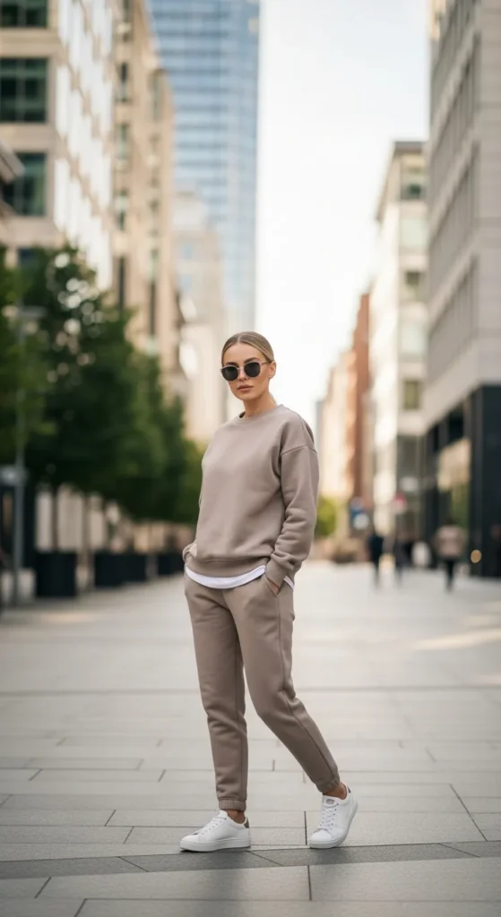 A matching sweat set in a neutral tone feels put together while staying ultra comfortable. Sneakers complete the look, making it perfect for casual outings.