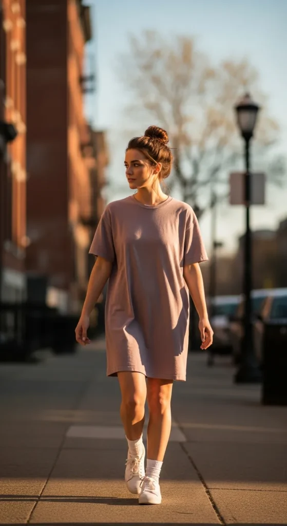 An oversized tee dress paired with sneakers feels carefree and modern. It’s ideal for warm spring days when you want comfort without sacrificing style.