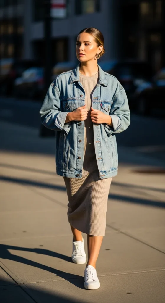 A soft ribbed midi dress paired with a slightly oversized denim jacket feels easy, modern, and flattering. Finished with clean sneakers, this outfit moves perfectly from coffee runs to casual evening walks.